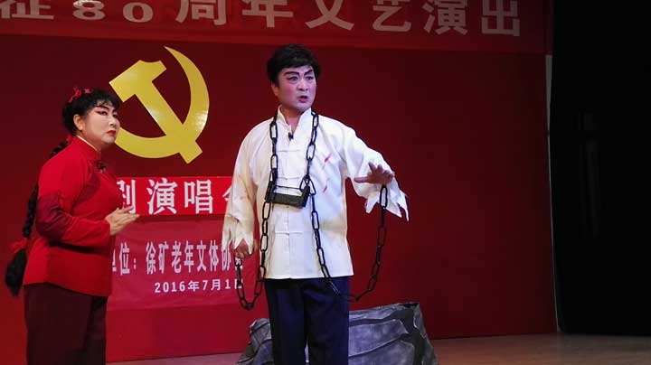 7月1日上午,市剧协、徐州汉风京韵社和“夕阳红”京剧队,在徐州矿务集团老年活动中心,联合举办了一场京剧演唱会。先后演出了京剧《红灯记》、《智取威虎山》、《江姐》、《龙江颂》等选段,演员们的精彩表演,赢得了台下的阵阵掌声。