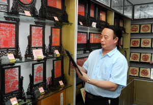 5月27日,记者现场进行了一番探访,进门就看到各种各样精美的剪纸整齐地摆放在货架上,左右两间房间是办公室,右边是吴国本的剪纸创作工作室,左边一间正在进行电子商务网上洽谈业务。