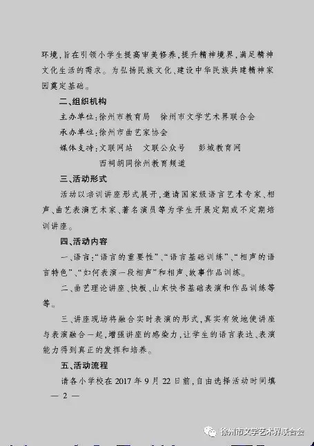 为加强小学生美育教育,培养良好的审美情趣和艺术素养,发现和培养语言艺术人才。徐州市教育局、徐州市文学艺术界联合会联合主办、徐州市曲艺家协会承办“高雅曲艺进校园——相声、快书等语言艺术培训讲座”活动即将举办。