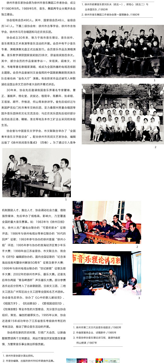 1. 徐州市音乐家协会编印的音乐书刊 2. 市音乐家协会召开音乐创作研讨会 /2009年 3. 徐州市音乐家协会第六次会员代表大会 /2008年